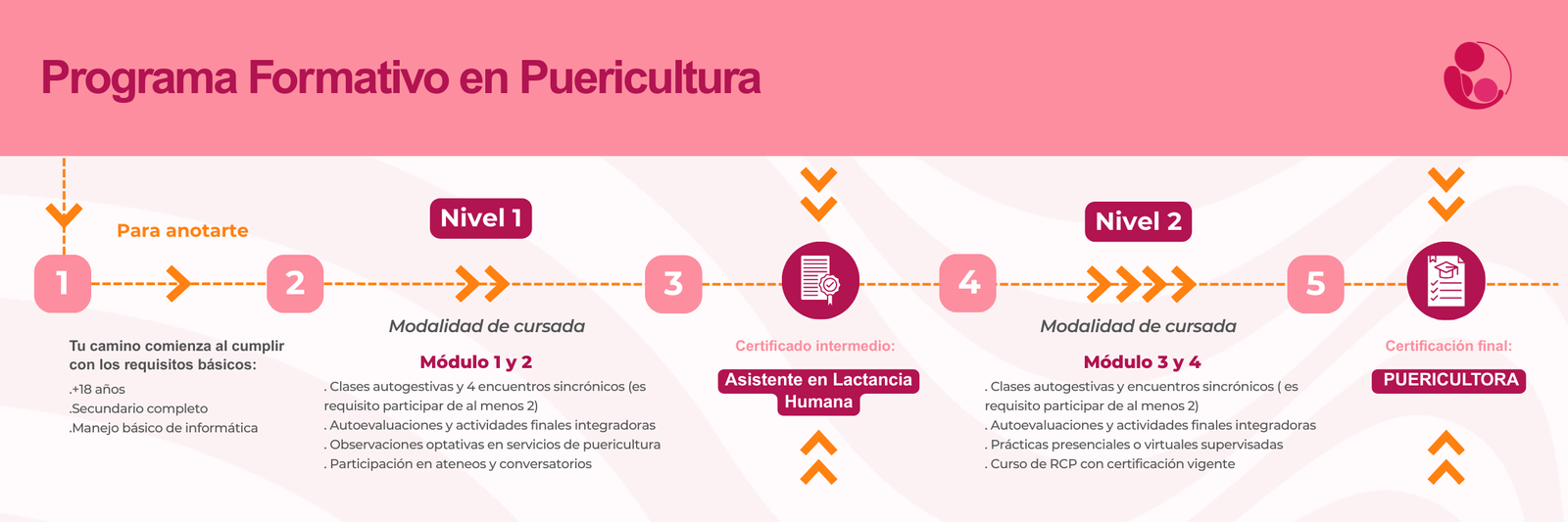 A lo largo del trayecto vas a aprender sobre lactancia, desarrollo infantil, comunicación con familias, salud perinatal, ética profesional y derechos en la gestación, parto y puerperio.